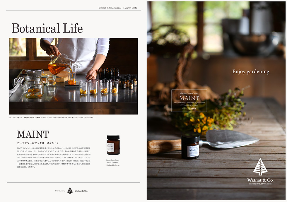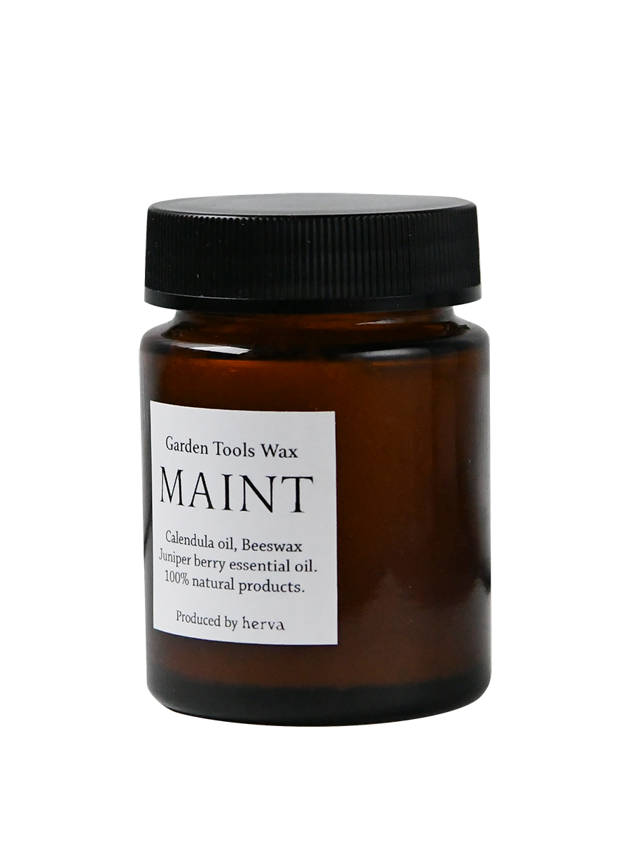 MAINT(メイント)は大切な道具を長く使いたい人の為にハーバリストがこだわりの天然素材を使って作った100%ナチュラルのメンテナンスワックスです。素材は不純物を取り除いた蜜蝋と抗酸化作用が高いと言われているカレンデュラを漬け込んだ植物性オイル、森の爽やかな香りのジュニパーベリーエッセンシャルオイルをherva独自のブレンドで作りました。園芸スコップなどの木柄や木工製品、革製品などに塗り込んでご使用ください。添加物、防腐剤、着色料などは一切使用していませんので安心してお使いいただけます。植物の香りを楽しみながら蜜蝋の保護効果をお試しください。