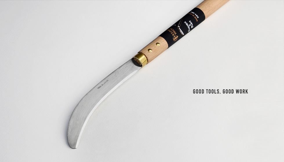 1912年に初代菊松(代表の祖父)が兄弟で鎌鍛冶屋を始めたのがはじまりで、戦争などで一度途絶えましたが、現代表の竹本好明が中学卒業後、鎌鍛冶に弟子入りし、祖父の兄弟にも教えを受け昭和35年に今の場所に竹本鎌製作所を立ち上げました。現在は3代目の竹本兄弟が鎌作りを継承しています。切れ味が良く手元で作業ができる日本鎌は海外のガーデナー達にも愛用されています。